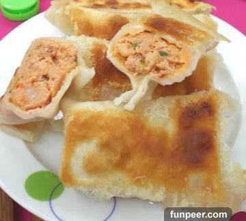 黃金糯米煎餅:用料:糯米150克,麵粉250克,雞蛋一個,火腿腸一條(重約40克),蔥、姜各適量;做法:一.準備工作:1.糯米放入電飯鍋內,加入適量的水煮熟成糯米飯,舀出晾涼;火腿腸切成小丁,蔥切花,生薑切成末二.和面:1.雞蛋打入麵粉中,用筷子將其稍稍攪拌,再加入適量的溫水,揉成光滑的麵糰,蓋上保鮮膜餳20分鐘三.炒糯米飯:1.熱鍋放油,下入薑末與火腿腸丁,稍炒幾下2.下入糯米飯炒勻;3.加入適量的鹽,放入蔥花,炒勻後舀出待用四.做麵餅啦:1.餳好的麵糰揉搓成長條,分成小劑子,將小劑子稍稍揉圓2.將揉圓的小劑子用手按扁,再用搟麵杖搟成薄片(厚度比餃子皮稍厚一些)3.將炒好的糯米飯放在麵皮上,將麵皮對折包好,邊緣捏緊,再將兩個角捏在一起4.平底鍋內放油,放入麵餅,小火將其煎至兩面金黃即可.