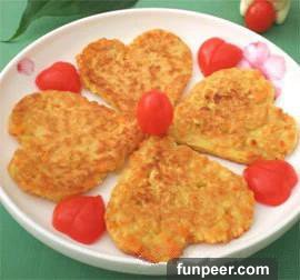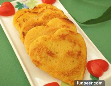 奶香愛心玉米煎餅:用料:玉米粉150克,牛奶150毫升,白糖適量(用量依個人口味放),一個心形的模具做法:1.將玉米粉與適量白糖放入大碗中,倒入牛奶拌勻;將心形模具洗淨擦乾待用2.開小火;平底鍋內放油,放入模具,用勺子舀適量的麵糊倒入模具中3.等玉米餅煎至成形後小心地取下模具,最後將玉米餅煎至兩面金黃熟透即可.