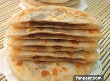 蔥油餅:用料:麵粉150克,蔥花、雞粉、鹽、芝麻各適量;做法:1.麵粉中加入適量的鹽與雞粉拌勻,再加入適量的溫水揉成麵糰,蓋上保鮮膜餳20分鐘;蔥洗淨,切成蔥花2.餳好的麵糰揉搓成條,再分成4個小劑子3.將小劑子搟成約0.3釐米的薄片,再刷上一層油,撒上蔥花4.再將麵皮順長邊捲起,揉搓成細長條5.將長條的兩頭向中間捲起,形成兩個面卷6.將兩個面卷重疊在一起,用手稍稍按扁一些7.再用搟麵杖將其搟成約0.5釐米厚的圓餅8.再將圓餅的兩面都沾上芝麻;9.平底鍋內放油,下入蔥花餅,小火將其煎黃一面後翻面,最後煎至兩黃金黃熟透即可.