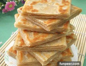 芝麻醬千層餅:用料:麵粉150克,芝麻醬、芝麻油各適量;做法:1.麵粉中加入適量的溫水揉成光滑的麵糰,蓋上保鮮膜餳二十分鐘2.芝麻醬中加入少許鹽與芝麻油調開3.將餳好的麵糰搟成約0.2釐米厚的長方形薄片4.用小刷子在麵皮上薄薄地刷上一層調好的芝麻醬5.將刷好芝麻醬的麵皮對折,將邊緣用手按緊6.將折好的麵皮再用搟麵杖搟開7.將4至6步驟重複一次8.再在搟開的麵皮上刷上芝麻醬,將麵皮的三分之一折起9.最後將麵皮分三次折好,再用搟麵杖將折好的麵皮稍稍搟開一些10.再用刀將其切成5份11.平底鍋內放油,下入千層餅,小火將其煎黃一面之後翻面,最後煎至兩面金黃中間熟透即可.