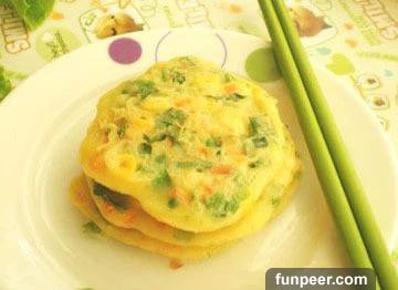什錦蔬菜煎餅:材料:玉米粒50克,胡蘿蔔30克,生菜30克,雞蛋3個,麵粉100克,蔥、芝麻油、胡椒粉各少許;做法:1.先將雞蛋打散成蛋液,加入少許胡椒粉拌勻,胡蘿蔔洗淨切成小粒,生菜洗淨瀝乾切碎,蔥切花;2.將胡蘿蔔粒和玉米粒放入沸水中煮熟後瀝乾待用;3.麵粉中加入適量的鹽,再倒入雞蛋液,加入適量的水攪拌成糊狀;4.放入瀝乾的胡蘿蔔粒和玉米粒、生菜、蔥花,再加入少許芝麻油,攪拌均勻;5.平底鍋內放少許油,用勺子將麵糊舀入鍋內,一勺子麵糊攤成一個煎餅,小火煎至兩黃微黃即