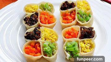 四喜蒸餃:主料:麵粉250克,豬上肉350克,韭菜150克,雞蛋1個;配料(四喜):西蘭花、玉米、胡蘿蔔、黑木耳各適量;調料:水80亳升,生薑、澱粉、生抽、芝麻油、胡椒粉各適量;做法:一.餡料:1.豬肉剁碎成肉末,加入一小勺澱粉抓勻,再分次加入80毫升水,一邊加水一邊順一個方向攪拌,直至將豬肉攪拌至較黏稠狀,放置十分鐘;2.再加入適量的鹽、胡椒粉、芝麻油、生抽,繼續朝一個方向攪拌均勻,醃製20分鐘;3.韭菜洗淨切碎,生薑切末,加入豬肉餡料中,朝一個方向攪拌均勻二.麵皮及配料:1.木耳提前泡發,洗淨後切成末;玉米粒煮熟後切碎,西蘭花、胡蘿蔔均切成末待用;2.麵粉中打入一個雞蛋,用筷子稍稍攪拌,再加入適量的開水,攪拌成雪花狀,再加入少量的冷水,揉成光滑的麵糰,蓋上保鮮膜餳二十分鐘3.餳好的麵糰揉搓成長條,再分成小劑子(比平時包餃子的劑子略大一些),將小劑子用手按扁,再用搟麵杖搟成薄麵皮三.包餃子:1.取適量的餡料放入麵皮的中央,將麵皮的兩邊對折,中間捏合在一起2.再將兩邊的麵皮也往中間對折,中間部份捏在一起,注意四個角的麵皮不要粘合3.再將每兩個角上相鄰麵皮的中間部份捏合在一起,形面四個孔眼4.最後每個孔眼內各放在一種裝飾用的配料,四喜蒸餃的生坯就做好了5.蒸鍋內放水,放入餃子,大火蒸10分鐘左右即可。