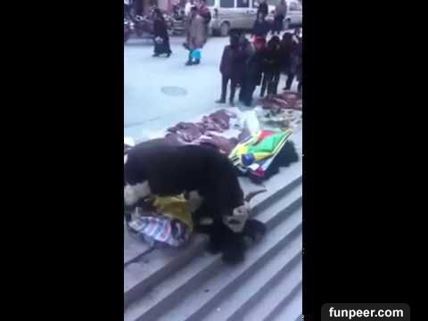 視頻中,大街上,路邊攤檔上擺著一堆剛宰下來的牛肉、牛內臟、以及一張牛皮,這頭母牛面對這張牛皮,難過得嚎啕大哭,撕心裂肺的哭聲震撼了路人,讓人好心酸! via-新唐人