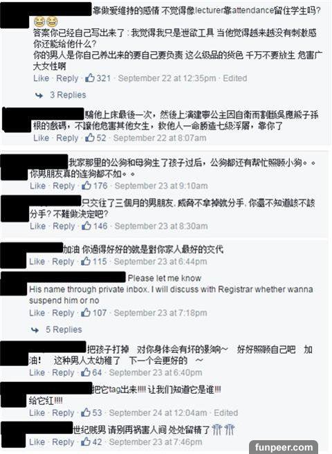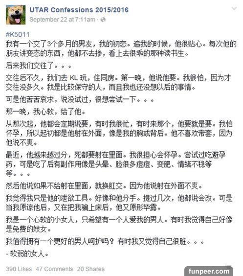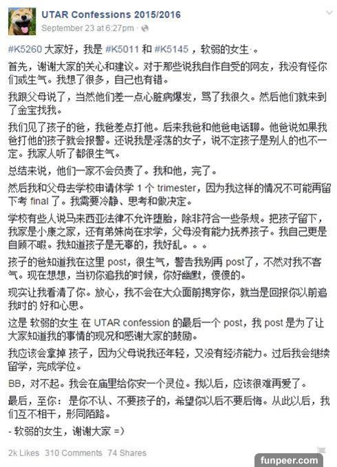 半天之後,女生髮最後一個帖子,表示已經跟家人說明這件事,並和男生家人電聊,差點發生衝突。男方也和女方的關係一刀兩斷! 第三個帖子內容: #K5260 大家好,我是 #K5011 和 #K5145 ,軟弱的女生·。 首先,謝謝大家的關心和建議。對於那些說我自作自受的網友,我沒有怪你們或生氣。我想了很多,自己也有錯。 我跟父母說了,當然他們差一點心臟病爆發,罵了我很久。然後他們就來到了金寶找我。 我們見了孩子的爸,我爸差點打他。後來我爸和他爸電話聊。他爸說如果我爸打他的孩子就會報警。還說我是淫蕩的女子,說不定孩子是別人的也不一定。我家人聽了都很生氣。 總結來說,他們一家不會負責了。我和他,完了。 然後我和父母去學校申請休學 1 個 trimester,因為我這樣的情況不可能再留下考 final了。我需要冷靜、思考和做決定。 學校有些人說馬來西亞法律不允許墮胎,除非符合一些條規。把孩子留下,我家是小康之家,還有弟妹尚在求學,父母沒有能力撫養孩子。我自己更是自顧不暇。我知道孩子是無辜的,我好亂。。。 孩子的爸知道我在這裡 post,很生氣,警告我別再post了,不然對我不客氣。現在想想,當初你追我的時候,你好幽默,傻傻的。 現實讓我看清了你。放心,我不會在大眾面前揭穿你,就當是回報你以前追我時的 好和心思。 這是 軟弱的女生 在 UTAR confession 的最後一個 post,我 post是為了讓大家知道我的事情的現況和感謝大家的鼓勵。 我應該會拿掉 孩子,因為父母說我還年輕,又沒有經濟能力。過後我會繼續留學,完成學位。 BB,對不起。我會在廟裡給你安一個靈位。我以後,應該很難再愛了。 最後,至你: 是你不認、不要孩子的,希望你以後不要後悔。從此以後,我們互不相干,形同陌路。 - 軟弱的女生,謝謝大家 =)