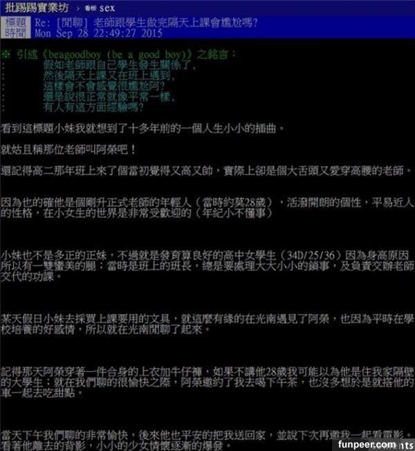她把第一次給了老師,以為自己是全世界最幸福的女人,上學時仍和老師眉目傳情,之後也愛愛了好幾次,地點在車上的次數也不少。