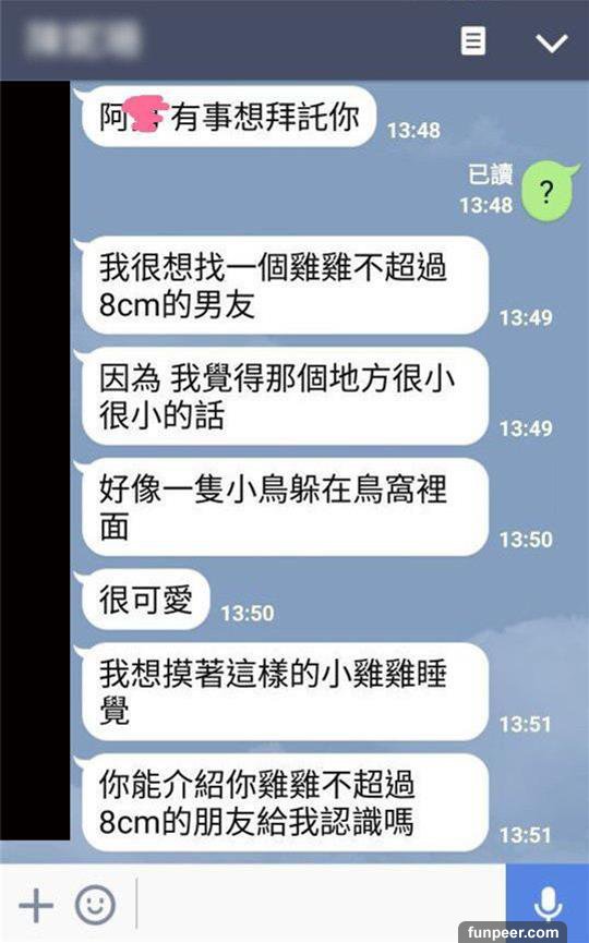 最近一位網友收到一位陌生正妹的交友請求?只不過這位正妹死活都想要雞雞小於8cm的男人做男朋友,所以請網友幫忙介紹。網友追問為什麼非要雞雞小於8cm的男朋友呢,正妹的回答....讓小弟萬萬沒想到!