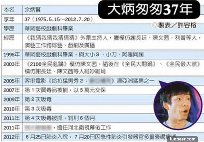 大炳離開人世前最後照片。(資料圖)大炳表演才華洋溢,以搞笑、模仿出名,曾模仿惠妮休斯敦、謝長廷出名,前景一片看好,受到好萊塢電影青睞,演齣電影《哈拉猛男秀2:歐亞種馬》,是小S、大S等人的高中同學,感情甚篤,「大嘴吞拳頭」、「高音飆唱惠妮休斯敦經典名曲」,都曾讓觀眾捧腹大笑,是眾人心中的開心果,不過他卻離不開毒品,在毒海浮浮沉沉,讓演藝圈的好友、家人失望。當時綜藝大哥張菲曾為他難過落淚,小S還為他求情:「不管發生什麼事,他在我心中還是原來那個有才華又幽默的大炳」,不過他卻自我放棄,連弟弟小炳都希望他被抓起來關。大炳曾有4次吸毒被捕紀錄,第3次是與男友一起被捕,被迫「出櫃」。當時他說,看見男友吸毒後的憔悴面容,才驚覺一定要戒毒。但2011年,大炳在朋友家中再次接觸毒品。大炳家庭負擔沉重,為了養家,他到音樂餐廳駐唱,每週一場,出場費在1萬元新台幣),他還到社區大學教學,主講表演與口語傳播等課程,生活頗為艱辛。2012年2月,大炳註冊微博,並於7月9日通過微博表示,「謝謝大家和媒體的關心,我很感動,有你們一直在支持我,我會儘快養好身體。」