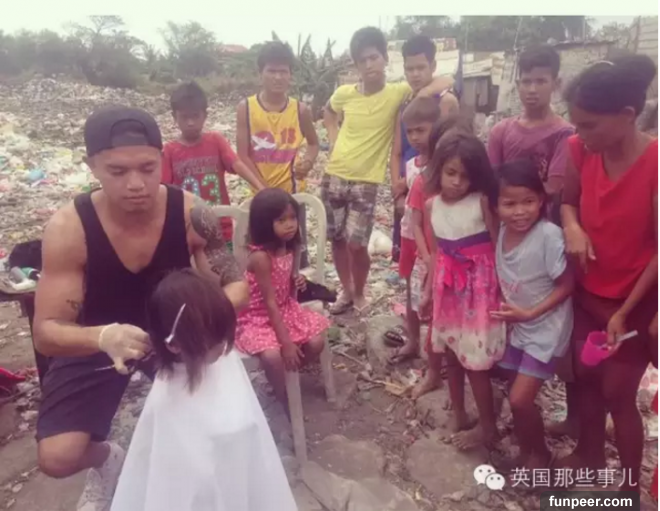 小哥決定做這件事的契機還要從3年前說起 那一年,他回老家菲律賓探親他看到當地孩子們受貧窮生活所迫,蓬頭垢面,沒有一絲朝氣.. 他決定用自己最擅長的方式,給他們的生活帶去一些改變... 他每天出門幫當地的孩子們免費理頭,就在這樣的廢墟之中,一個個孩子等待著被「改頭換面」