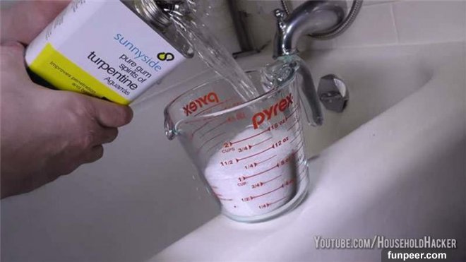 ▼6.浴盆使用一段時間後會堆積污漬,將食鹽和松節油混合,攪拌一下。將沒有融化的食鹽撈出來清理浴缸,幾分鐘就能讓浴缸光亮如新。