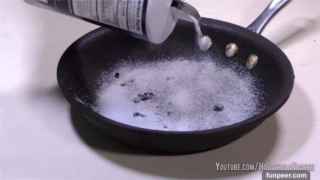 ▼4.做料理時鍋底的焦糊物質很頭痛吧。只要加入一些食鹽,與水混合,靜置10分鐘,焦糊的物質就會自動脫離,再刷一下就乾淨了。