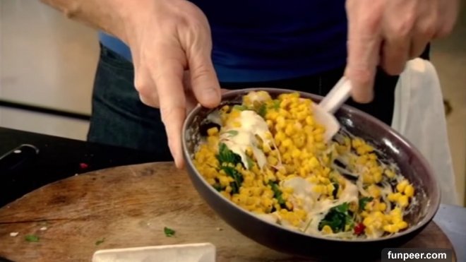 倒入甜椒、洋蔥切丁、蒜末、辣椒末和香菜,加入玉米罐頭,混合均勻。![]()