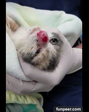 沒錯,這隻可憐的小貓鼻子腫得超大,明顯感覺得出有東西寄生在裡面!