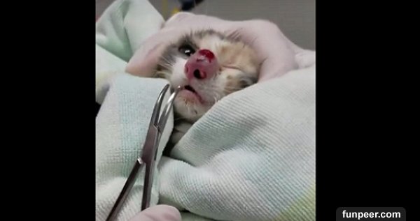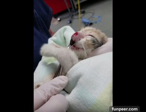 於是主人抱去給獸醫處理,過程中小貓因疼痛,淒厲的喵喵叫、不斷拍打醫生的手,看到牠痛苦掙扎真的很不忍心!