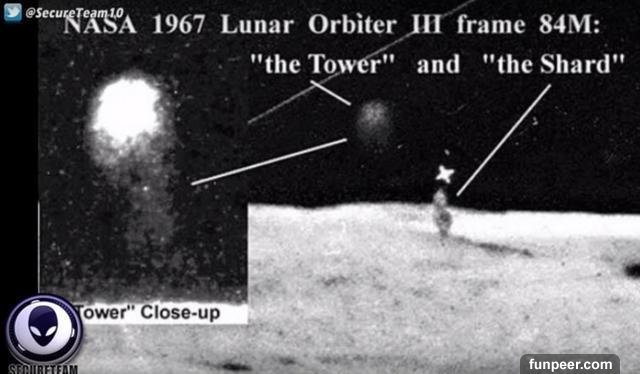 片段隨後再展示一張由前蘇聯探測器於1960年代末拍下的照片,可見畫面右方出現可疑的柱狀物,懷疑是一座塔。旁白指,這意味月球有外星生物存在,更指美國太空總署(NASA)曾刻意隱瞞,抹去影象中的柱狀物。其後片段討論一張NASA攝於1967年的照片,指該照片亦拍到柱狀物。