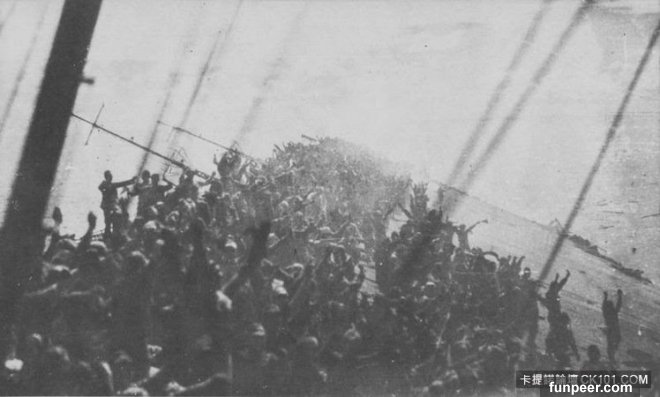 圖為日本航母瑞鶴號沉沒前的場景。1944年10月25日,萊特灣海戰中,瑞鶴號被美軍7枚炸彈7枚魚雷擊中而沉沒。航母上的日本士兵正慌亂的跳水。