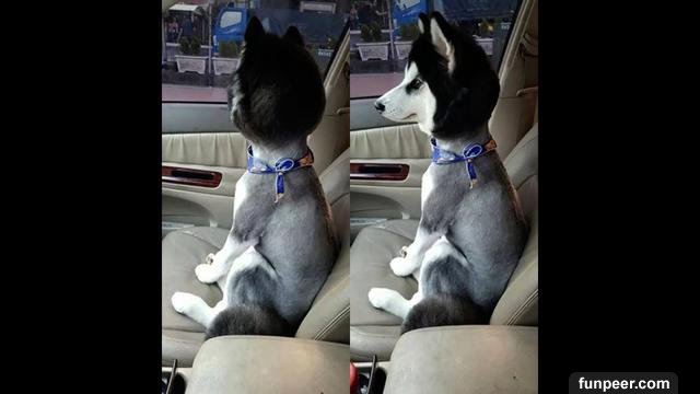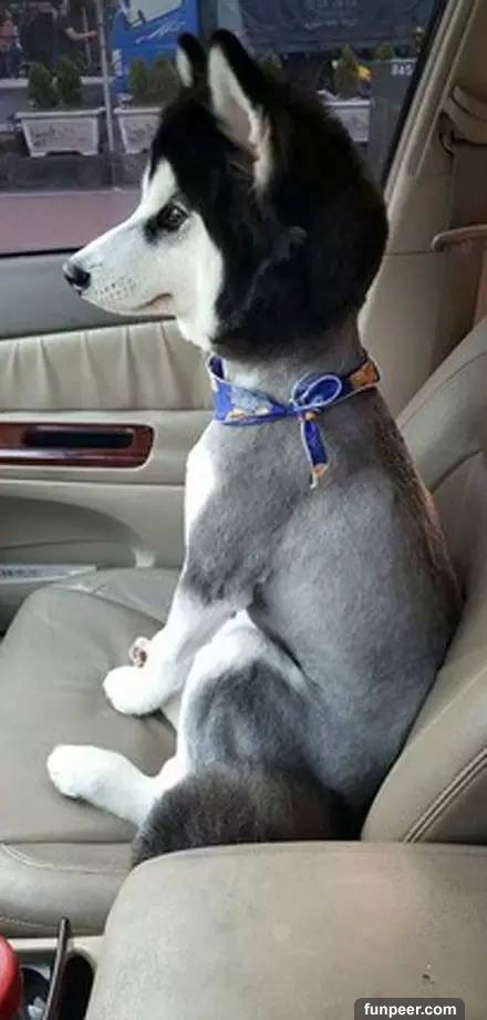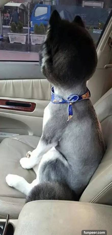 只見這只哈士奇全身上下的毛幾乎都被剃短,就連頭毛也被塑形成圓弧狀,難怪它超級鬱悶的一直望著窗外,一點都不想理主人呢!