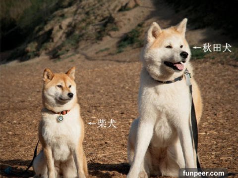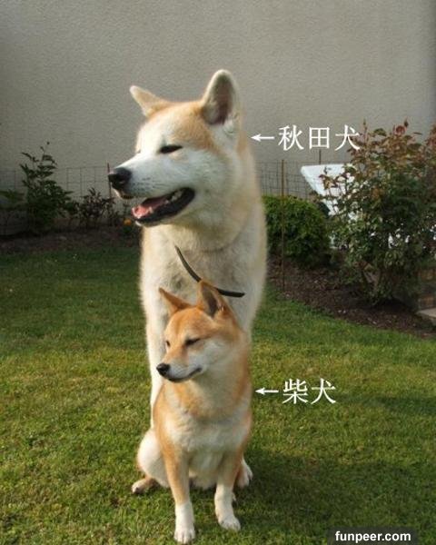這張圖,大的是秋田。小的是柴犬。秋田種類有赤秋,虎斑,霜降,白秋。柴有黑柴,赤柴,胡麻。