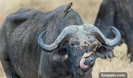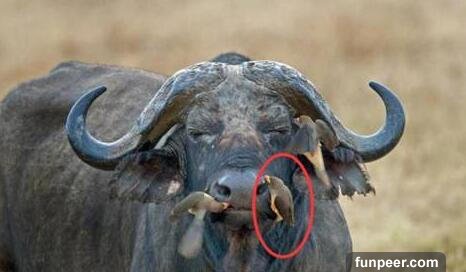 這畫面真的讓他嚇到了!當下第一個反應就是:「莫非是野牛群感染了什麼怪病?才導致寄生蟲侵入鼻子裡面?」但後來他仔細一看後,竟發現那生物其實是一隻小鳥!