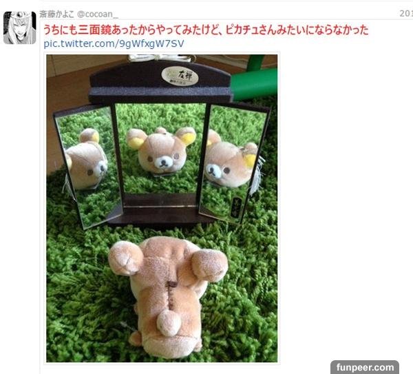 日前,有日本網友在Twitter上貼出一張照片,說他有天無聊就把皮卡丘公仔放在三面鏡前,結果卻把他嚇壞了!![]()