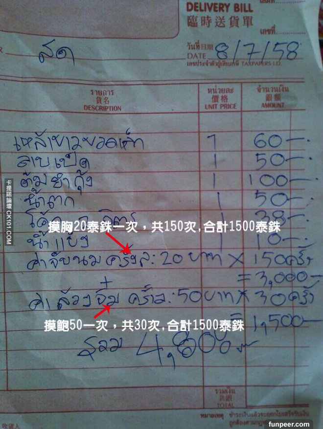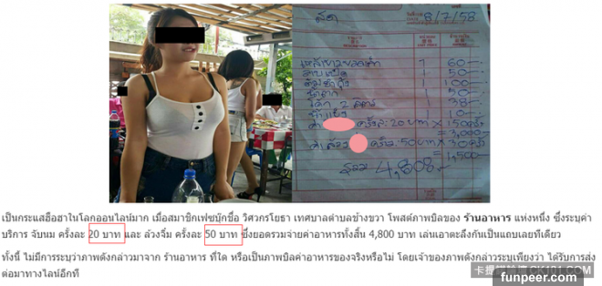 原po賬單明細表示一共消費4800泰銖,賬單中明確點出了除了普通家常菜的價格之外,另外包含了對辣妹服務員摸胸和摸下體的費用。摸一次胸要付20泰銖,摸鮑魚需要花費50泰銖。