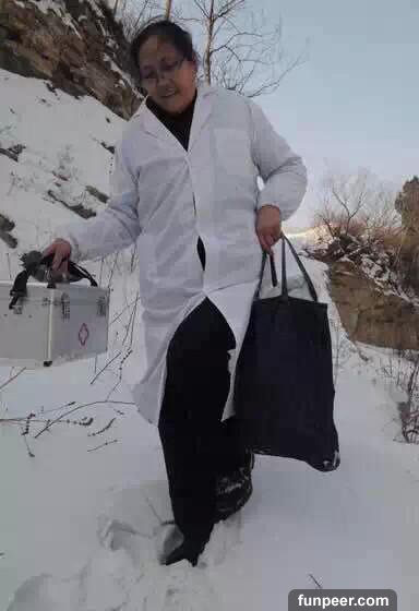 【第十七張】▶山東淄博市淄川區嶺子鎮雙峪村,60歲的孫鳳蓮給村民看病已經堅持44年了。圖為走在積雪的山路上。