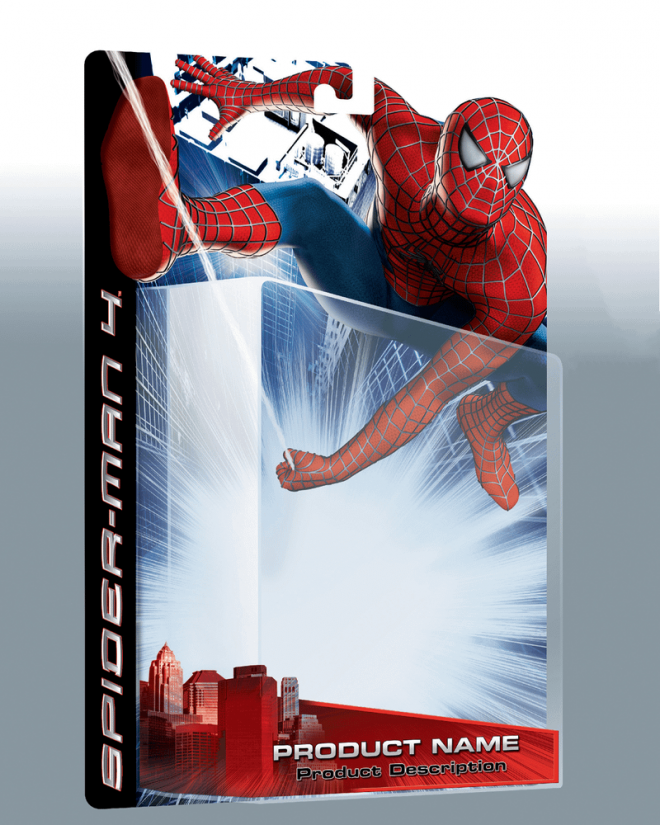 While the toys aren"t present, the packaging shows Spider-Man in his iconic red and blue suit with sharp light eyes and grey webbing: