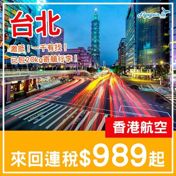 【台北】癲!繼續一千有找!香港航空來回台北連稅$989起,包20kg寄艙行李!5月頭至7月中出發