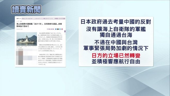 這與過去多數與美軍或其他盟國聯合行動大不相同,展現出日本對於台海局勢的全新態度。