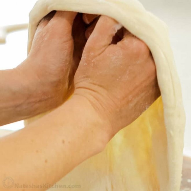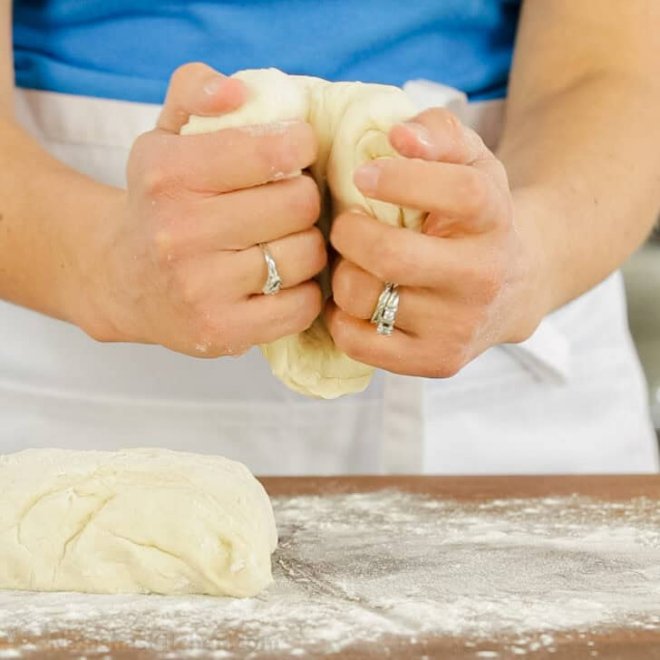 Transfer dough onto a floured surface and divide in half. Fold each piece of dough 8 times (rotating book fold) and form a ball. Transfer to an oiled bowl, cover, and refrigerate overnight or up to 7 days. Your dough is done.Why Fold the Pizza Dough?Folding the dough balls 8 times with the ‘book fold’ and turning the dough between each fold strengthens the gluten threads and traps carbon dioxide created by the yeast, which helps form those beautiful bubbles in the dough.