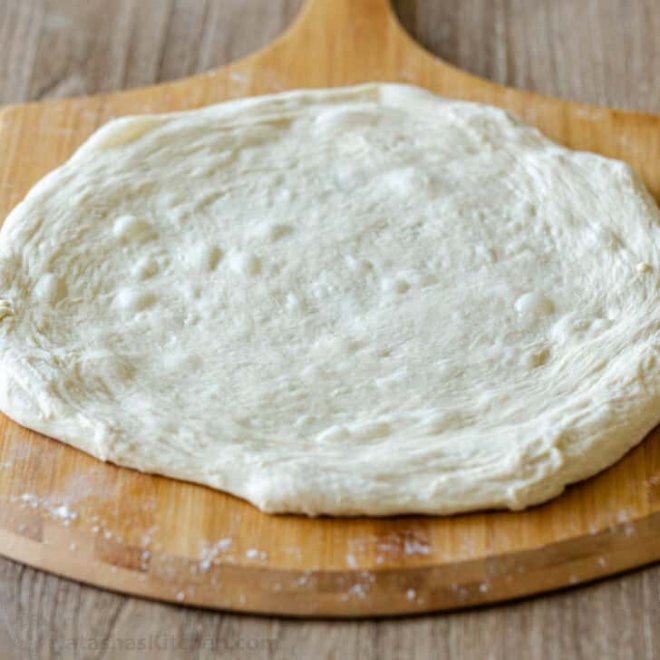 You can dust the pizza peel with the flour you are using to make the dough, or dust with semolina flour if you have it on hand. It’s what the pros use for easier transfer from the pizza peel to the oven. Pro Tip:Do not use too much yeast! Most ‘quick’ pizza doughs use way too much yeast which makes the crust doughy and causes the center of the pizza rise while baking. If you use too much yeast, you will never achieve that thin crisp crust in the center.