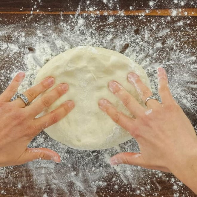 Gently press the dough down in the center with your fingertips, then place the dough over the back of your knuckles with both hands together and roll over your knuckles, rotating around the dough as you go, keeping a 1″ thicker border. Place 10-12″ diameter crust onto a floured pizza peel.
