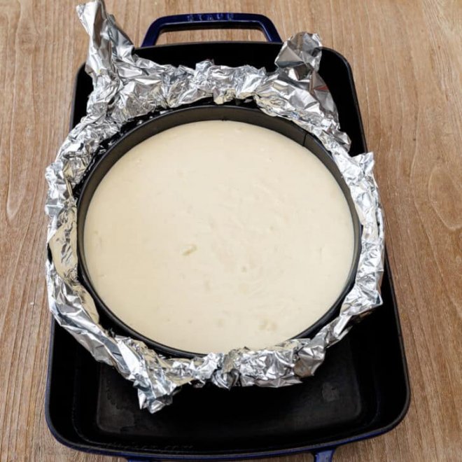 Remove the cheesecake from the oven and let it rest in the roasting pan with water for 45 minutes then discard the foil and set the springform pan on a wire rack to cool completely. Once fully cooled, cover the springform pan and chill in the refrigerator for at least 8 hours or overnight to fully set before serving.How to Prevent Cracks in a CheesecakeBaking with the water bath method is the secret to achieving a perfectly risen cheesecake with a smooth, level top. The water helps maintain a consistent temperature and adds moisture to prevent cracks. Wrapping the springform pan in foil creates a barrier that keeps water from seeping into your cheesecake, ensuring the crust stays dry and intact.