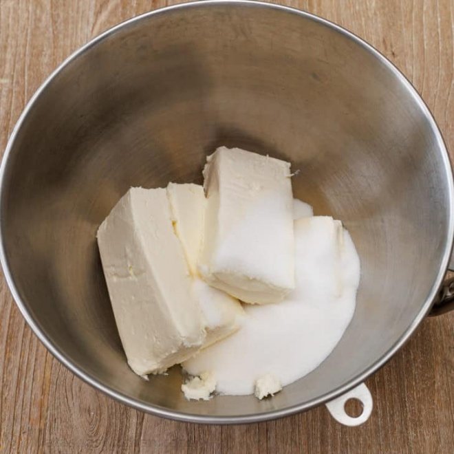 Mix cream cheese and sugar – In the bowl of a stand mixer fitted with a paddle attachment (or using an electric hand mixer), beat cream cheese and sugar on medium/high speed for 5 minutes until completely smooth, scraping down the bowl as needed.
