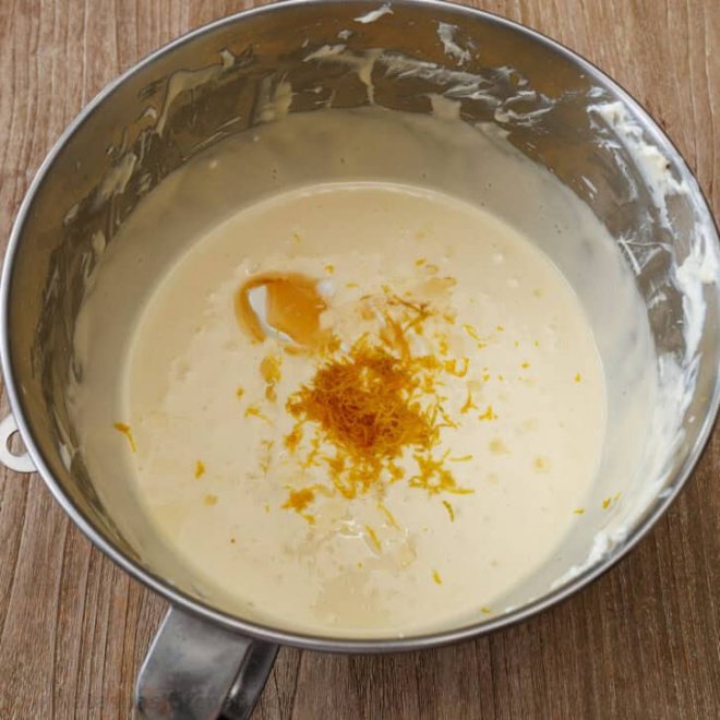 Reduce the speed to low and add sour cream, lemon zest, lemon juice, and vanilla. Mix on low speed just until incorporated, scraping down the bowl as needed. Pour cheesecake batter over the cooled crust.