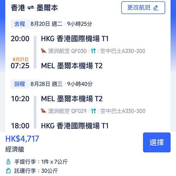 香港/墨爾本 QF30 20:00/07:25(+1)