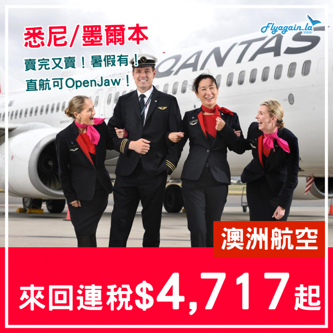 【澳洲】淡季賣完又賣!澳洲航空來回墨爾本、悉尼連稅$4,787起!可Open Jaw!11月15日前出發