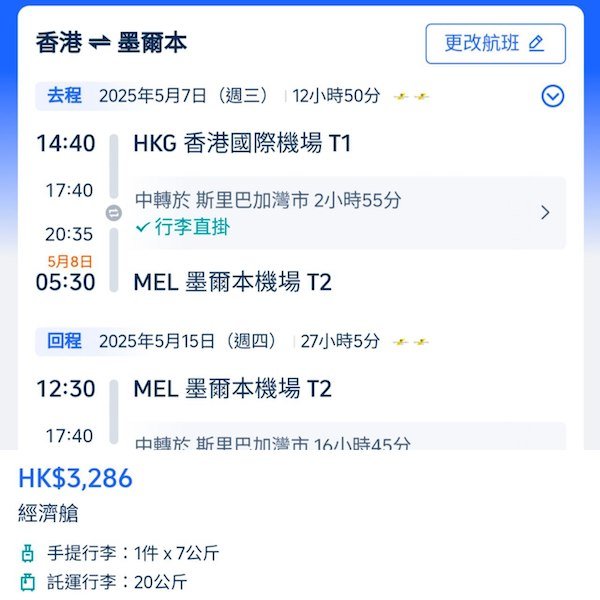來回連稅價錢:HK$3,286起(包20kg行李,如包25kg行李則為HK$3,689起)