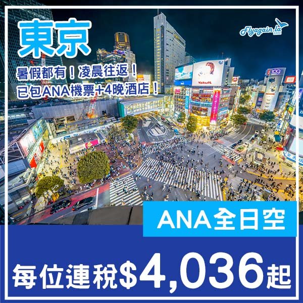 【東京】暑假都有!坐ANA凌晨往返!東京6日4夜套票,包來回機票+4晚酒店,每位連稅$4,036起!4月至9月指定日子出發