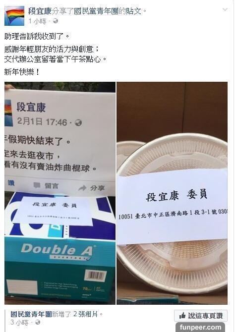 青年團來到立法院後,段宜康辦公室也順勢收下這份禮物,讓青年團成員忍不住大贊「了不起,負責!」;段宜康則在臉書表示,助理告訴他收到曲棍球了,感謝年輕朋友的活力與創意,已經交代辦公室留著,「當下午茶點心」;青年團則在下面留言,要段宜康「寫篇食記吧!」