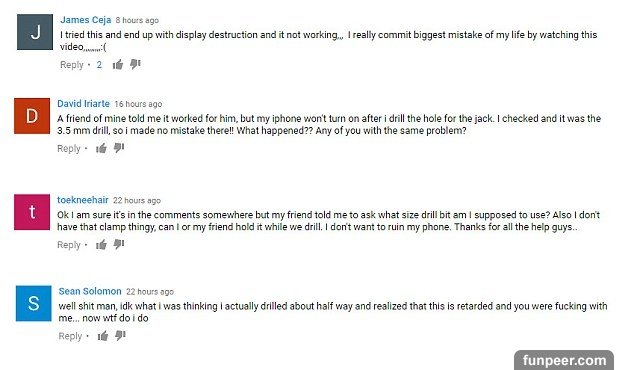 xhttps://www.youtube.com/watch?v=5tqH-Un9SFU▼好啦,相信聰明的大家應該知道這是騙人的吧?!或至少有覺得懷疑吧?顯然很多人卻信以為真了。因為許多人在下面留言抱怨他們的慘痛失敗!「我試了結果最後螢幕損毀不能用了…看這影片真的是我一生最大的錯誤…」「我一個朋友跟我說這有用,但我鑽完後我的手機就打不開了。我還檢查確認是3.5mm鑽頭,所以我沒搞錯!到底怎麼了?大家也有相同的問題嗎?」