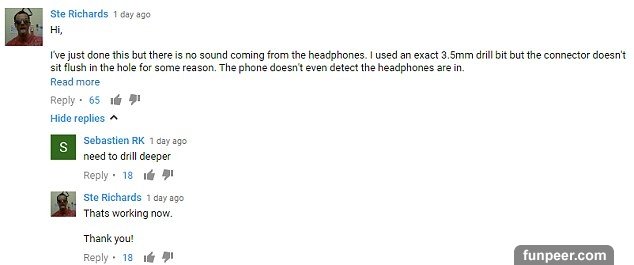 ▼還有人認真發問:「我很確定底下留言一定有提到,但我朋友要我問我到底該用哪種鑽頭鑽?另外我沒有固定的東西,我跟我朋友扶住手機鑽可以嗎?我不想毀了手機,感謝大家幫忙…」另外也有太晚發現的:「該死,我不知道我在想啥,但我還真的鑽了一半才意識到這簡直白痴,你們只是想惡搞我…現在我該怎麼辦?」還有這種反串發問跟反串解答玩得很開心的:「嗨,我剛剛鑽完了但耳機孔沒聲音,我是用3.5mm鑽頭但耳機接頭不知為何卡不太順,手機甚至感應不到耳機插進去了。」