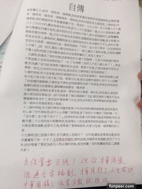 下面是是自傳的還原文字:「我是獨生子,家有一個爸爸一個媽媽,我爸爸那邊有兩個哥哥兩個姊姊,我媽那邊有一個哥哥一個弟弟一個姊姊和一個妹妹,我有四個堂哥五個堂姐,三個表哥,四個表姐,我的親戚有好多個,數都數不完。我是於一九九七年一月十四號上午七點三十三分出生的,據說是個良辰吉時,那天八大行星連成一線,北斗七星倒過來,聽說太陽還從西邊升起呢,看來我的出生非常的不得了,那天是個雷雨天,雷聲轟隆隆像是龍在咆哮一般,天空中的雲朵成長條狀,感覺就像是龍的身軀,海水倒灌,吳郭魚逆流而上,雞鳴狗吠,種種現象足以證明我的出生是多麼的不平凡,我的外婆是我出生時第一個抱我的,他一看到我就說:『哎呀!這小伙子將來一定是個領袖之才啊!』話一說完,還是小嬰兒的我伸出了一隻手,擺出了勝利姿態,沒想到,還聽不懂人話的我就已經明顯表達我未來是要幹嘛的了,真是太神奇了。五歲時,我遇見了我的初戀,我牽著他的手,親了他臉頰一下,對方很害羞的要我不要這樣,只見我很成熟的說了一句:『怕神麼!我們又不是三歲小孩了!』就這樣,因為講了這句話,使得對方離我而去,但我一點都不在意,天涯何處無芳草何必單戀一枝花,比你好的女孩多的是看來我在五歲時就已經是個情聖了。 七歲的時候,有天在家裡,我把玩著兩把西瓜刀,從我家後陽台一路砍到前陽台,就是手起刀落手起刀落手起刀落,一眼都沒扎過,就在這樣的過程中,我不小心砍斷了我爸種的楊桃樹,不過我並不害怕,我很誠實地告訴了我爸爸,我爸也因為我很誠實的原因沒有責罵我,還稱讚我誠實是一種美德。十歲的時候,在學校走著走著,看到一群低年級生圍著一個水缸,我走過去,發現有個小朋友困在裡面,我二話不說就拿了個石頭砸破了水缸,砸完後對方還來不及說聲謝謝我就消失了,後來這件事就傳了出去,成為全校師生津津樂道的故事,要成為一個無名英雄就要從小做起。 十三歲的時候,有天跟同學在河邊放風箏,不知為何我阿姨經過那裡,他怕我著涼好心拿了件外套給我,卻不小心弄斷了風箏線,當下我怒火中燒回了我阿姨一句:『涼什麼!老子都不老子了!』但神奇的是,我偉大的母親可能是有順風耳吧,在離河邊二十公里的家中都聽得到,他當場以三倍音速飛奔到我這裡,給了我一記上勾拳並要我道歉,從那次之後,我學會了要尊敬師長,友愛父母,做一個孝順的好小孩。 十九歲時,我已是個大學生,有天課堂上老師出了一份作業,聽說是要寫自傳,我洋洋灑灑寫了快一千字了,全部都是用掰的,掰到這裡,我覺得非常感動,我活了十九年,終於學會了要成為政治人物必備的技能就是唬爛!我的唬爛就到這了,謝謝大家!」由於自傳表達地實在太強大,讓網友看到都忍不住笑翻了!甚至表示「你確定這是自傳? 我差點以為是哪個痿人的事蹟」「87分 不能再高」「狂啊 別當編劇了當唬爛王比較快」「笑到一個美叮噹」,這則自傳僅有拿到10分,可見網友該篇自傳果然是狂到不能再狂呀!趕快分享給你朋友,讓大家也看看吧!