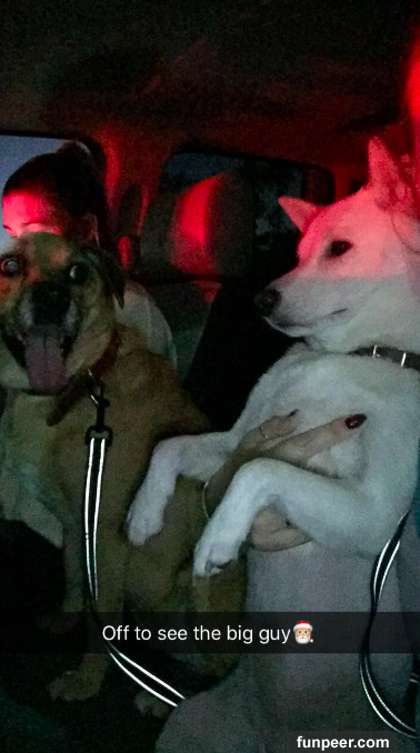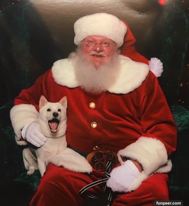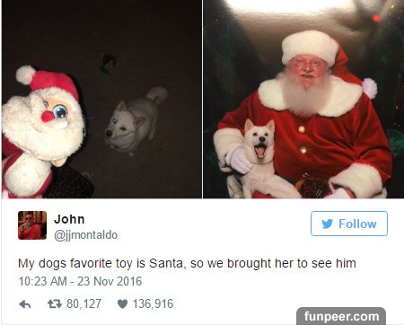 一隻住在美國奧蘭多的白色柴犬「卡雅」(Kya),自從去年收到主人送給牠的聖誕老人娃娃後,就變成聖誕老人的死忠粉絲…一年365天,走到哪一定都叼著娃娃,連主人回家時都看到牠咬著娃娃迎接!卡雅喜歡娃娃到主人還得買一個備用的給牠!▼牠的主人兄妹檔「約翰」和「安潔莉娜」某天經過附近賣場時,碰巧看見上頭貼的廣告「跟聖誕老人拍寵物照」!他們眼睛一亮,決定為小寶貝準備一份大驚喜…