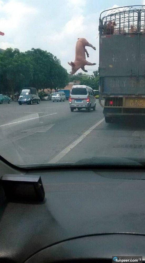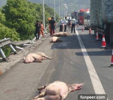 有兩隻大肥豬在被運往肉品市場屠宰的路上知道自己命不久矣,結果竟跳車求生!他們找到機會直接一躍而下!無奈墜地時角度不對,且加上重力加速度的影響導致傷勢過重,更被懷疑遭其他車輛撞擊,目前渾身傷痕,口鼻一直冒出白血倒在路上!救援人員獲報後趕緊到現場處理,將兩隻可憐小豬送回肉品市場,但因不知失主是誰,兩隻逃豬可能直接被銷毀。不曉得大家有沒有看過載滿豬的車子??小時候玩到快天亮才回家的時候,總會看見載滿死豬的車子要前往市場,但到了今天才真正體會到他們好可憐… 在經過這次的事件後,我想我以後都不會再吃豬肉了,其實這些小豬被逼著跳車也不是第一次發生…▼小豬都要被載去賣掉了,有隻小豬不甘自己的命運只能這樣,於是他…