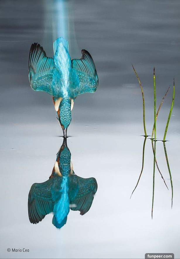 ▼4. Mario Cea,西班牙籍,《藍色線索》。翠鳥每天都會早訪熟悉的池塘,攝影師也採用了高速快門捕抓到翠鳥正要衝入水面的瞬間那一秒。