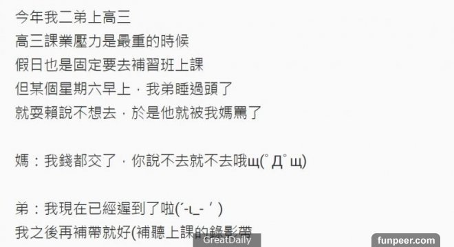 我之後再補帶就好(補聽上課的錄影帶媽:不行!你給我去聽現場的!弟:不要!這時我爸加入戰局了爸:為什麼你不去!錢都交了!弟:我現在遲到太久了!直接補帶比較快爸:那你現在給我上車我載你我弟看我爸感覺快要生氣了