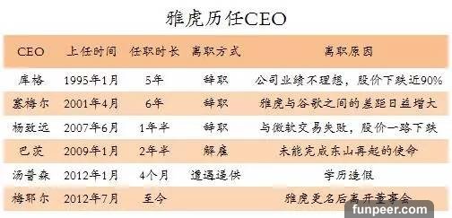 雅虎收購的部分公司結果,不少公司在被收購後不久便關停了業務或逐漸消失,雅虎因此被稱為「創業公司殺手」。 ②大公司病上身隨着規模越來越大,雅虎官僚作風日盛,造成組織資源的大量浪費。迄今為止,互聯網領域最成功的公司基本都是創始人主導,唯獨雅虎是 職業經理人主導。更加奇葩的是,雅虎22年換了7任CEO,最長的任期6年,短的僅4個月就被董事會趕下台。