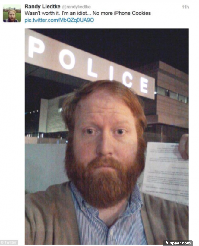 警察們發現自己捉弄後,非常生氣,卻也無可奈何,正準備提醒蘭迪最好小心一點後,就讓他走,卻發現蘭迪的確違規了!沒錯,蘭迪違規停車了,警察請他馬上到警察局走一趟!弄巧成拙的蘭迪從警察局走出來後非常沮喪,在推特寫到:「不值得,我真是個智障。我再也不烤iPhone餅乾了。」 ▼可憐的蘭迪啊XD