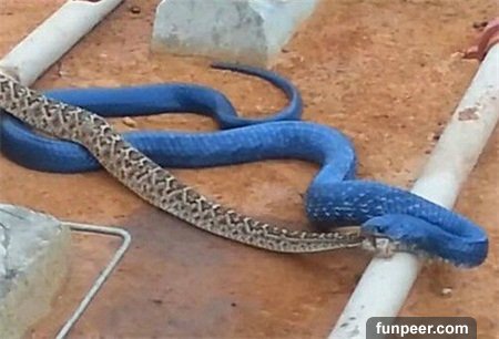 6 / 12實拍藍蛇吞噬眼鏡王蛇的圖片,圖中它寶藍色身體讓人們既敬畏又忍不住讚歎