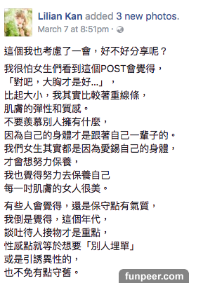 而她對對於美也有一套心得,最近更於facebook上分享她扮靚的秘訣:很怕女生們看到這個POST會覺得,「對吧,大胸才是好…」,